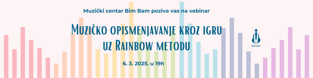 Dobro došli na Bim Bam vebinar Muzičko opismenjavanje kroz igru uz Rainbow metodu. Dve godine nakon našeg najgledanijeg vebinara Rainbow metoda – korak po korak, evo vebinara u kojem ćete videti najkorisnije i najzabavnije igre koje koriste Rainbow metodu za početno, neformalno opismenjavanje. Ukoliko vas interesuje kako početi, od kog uzrasta, na koji način, uz koje igre i sa kojim očekivanjima, onda je ovaj vebinar odlična prilika da dobijete nove ideje za svakodnevni rad. Šta to možemo raditi kod kuće, u vrtiću, školi, radionici ili kod logopeda, bile su teme koje smo spakovali u 2 sata intenzivnog online treninga. Prijavite se ovde i dobićete sve informacije kako da pogledate vebinar.